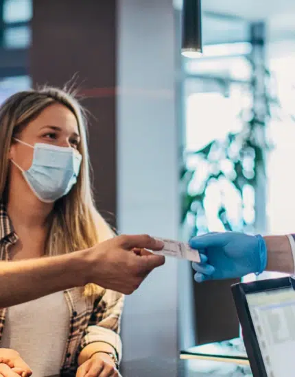 Two people wearing masks check in at a counter, handing a document to a staff member in a blue suit and mask.